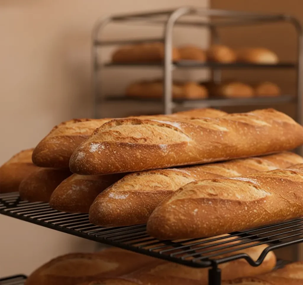 Knusprig, goldbraun und innen herrlich locker, unser Baguette passt perfekt zu jedem Anlass, ob herzhaft oder süß belegt.