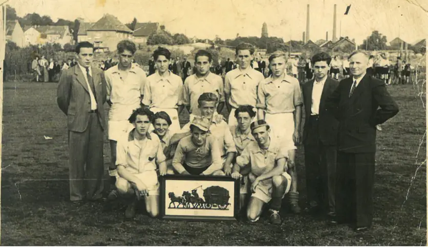 Auf dem ersten Foto zu sehen ist Alois Adolph (ganz rechts) zusammen mit der Wehrdener Fußballmannschaft. Das Foto entstand Anfang der 1940er Jahre. Zu dieser Zeit befand sich der Sportplatz noch an der Stelle, wo heute die St.Hedwig Kirche steht, also quasi direkt neben unserer Bäckerei. Die Umkleidekabinen auf dem Sportplatz waren damals noch nicht beheizt und die Sportler mussten sich im Winter in der Kälte umziehen.